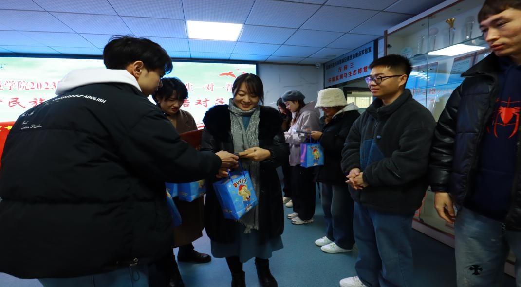 见面会伊始,由学生代表公布了少数民族同学和对应帮扶人员的结对名单,借此机会,研会成员与其帮扶的少数民族同学面对面加强了沟通交流,拉近了彼此之间的距离,建立了彼此间的友情。随后陈琴副部长、曾庆欢副部长和李岚书记向现场的同学们表示关怀,勉励在场的各位同学要团结向上,互帮互助,共同进步。最后各位领导、老师们为同学们送上了冬日关怀礼盒,预祝同学们新年快乐!
