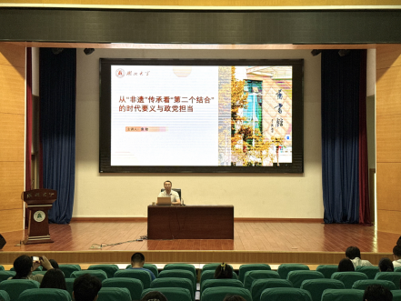 旅游学院党委副书记袁勋老师以“从‘非遗’传承看‘第二个结合’的时代要义与政党担当”为主题作专题辅导报告,通过传统戏曲、手工技艺等非遗案例,深刻阐释“第二个结合”为传统文化创造性转化、创新性发展提供的理论指引,表明党在非遗保护中的引领作用,让同学们明晰传承使命与文化发展责任。