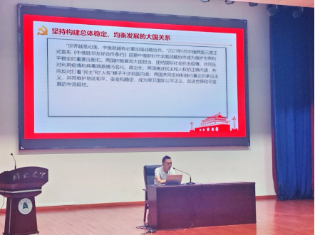 历史文化学院辅导员程一老师以“中美关系新动向与中国特色大国外交”为主题,围绕如何应对关税政策这一议题展开专题报告,表明中国始终秉持人类命运共同体理念,坚定不移地与各国携手同行,在顺应历史发展规律中把握前进方向,在引领时代发展潮流中彰显大国担当。