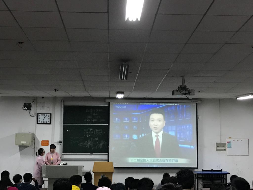 16地科班级则播放了一首两会版的《成都》,让大家先沉浸在轻松愉悦的氛围之后,再通过央视的“两会”报道,带领大家一同走进“两会”现场,一感“两会”盛大而庄严的会场,了解“两会”的开展过程以及其主要的内容。