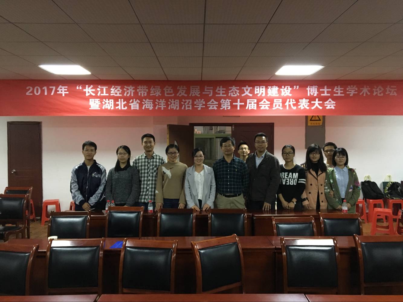由湖北省海洋湖沼学会举办,武汉大学资源与环境科学学院承办的2017年“长江经济带绿色发展与生态文明建设”博士生学术论坛暨湖北省海洋湖沼学会第十届会员代表大会于2017年10月28-29日在武汉大学举行。我院师生在汪正祥院长的带领下,参加了此次学术会议。