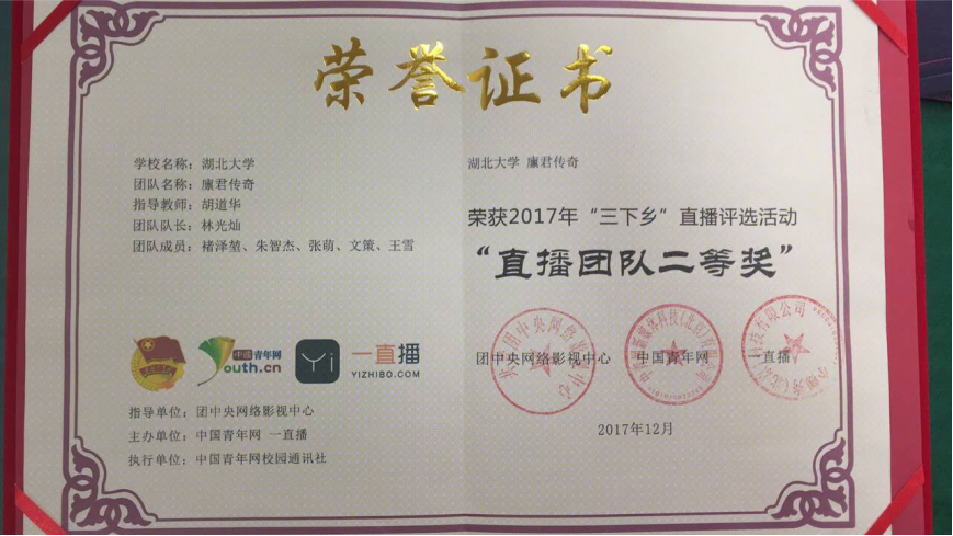 12月26日,由团中央影视中心指导,中国青年网联合一直播共同举办的2017年全国大中专学生暑期“三下乡”社会实践直播评选活动的授奖仪式在北京隆重举行。本次评选共计240余所大中专院校的4900余支实践团队和个人参与活动,经过激烈地角逐,资源环境学院暑期社会实践团队“英国上市公司365廪君传奇团队”在此次暑期“三下乡”社会实践直播评选活动中荣获“优秀直播团队二等奖”,指导老师胡道华获“优秀直播指导教师奖”,队长林光灿获“直播之星奖”。