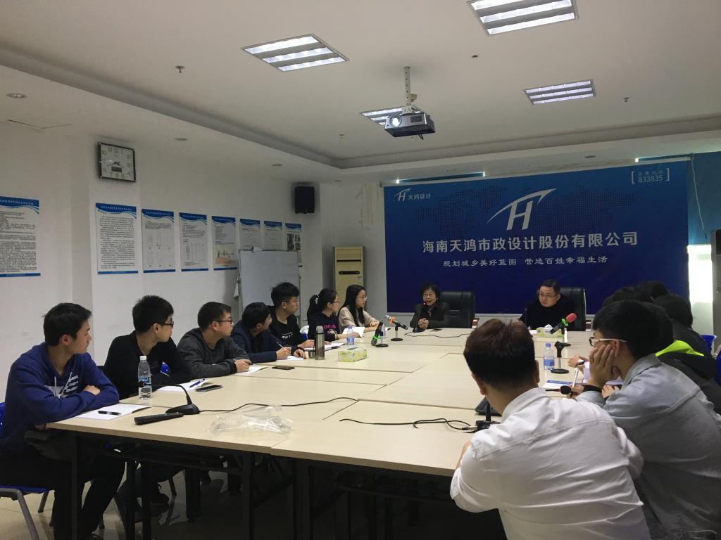 1月16日上午,海南天鸿市政设计股份有限公司柏斌董事长及公司相关部门主要负责人与天鸿班学生召开了见面会,会上柏斌董事长对学院师生一行表示热烈的欢迎,对学院高度重视本次教育实践活动表示感谢,同时对学校和学院师生对于天鸿公司的支持表示感谢。会上柏斌董事长耐心的聆听同学们的自我介绍,并跟同学们进行了深入的交流,他希望同学们珍惜这样的机会,在实践工作中,将理论与实践相结合,将学院文化和企业文化相结合,艰苦奋斗,脚踏实地,在工作中学习做人、做事,争取更好的成长,等毕业走向工作岗位,能充分发挥自身优势,迅速成长为公司发展的中坚力量。会上,卢进登老师代表师生一行对天鸿公司为本次学生实习做出的努力表示感谢,感谢天鸿公司为学生提供这样一线实践的宝贵机会,并对全体学员提出了三点具体要求,一是要高度重视本次实践经历,珍惜学习机会,端正学习态度,不要辜负学院和天鸿公司的努力付出;二是要常怀感恩之心,虚心学习,学习做人、学习做事。向身边优秀的同事、领导学习,同学们之间要互相学习、互相帮助、共同成长;三是多思考、多总结,每天实习工作中要多思考,尤其是一线工作过程中要做到不懂就问,每天实习结束要总结实习的感悟,本次实习结束之后高标准、高质量完成实习总结报告,下学期开学初将召开实习总结交流会。会后,卢进登老师与公司本次实习负责人共同商讨确定了本次实习的方案,王文锋老师还特别跟全体学员强调了本次实习的纪律,要求同学们实习期间一律集体活动,服从安排,统一行动,每晚班长查寝,向学院报告情况。