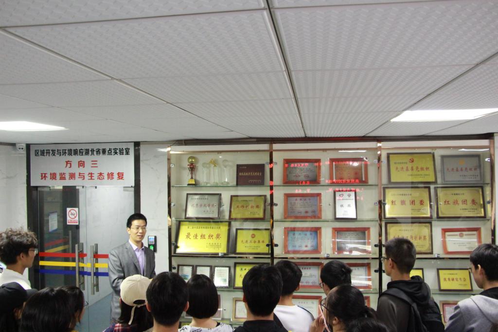 在院史院情教育环节,李明老师带领同学们逐层参观了资源环境大楼并对学院所获荣誉、师资情况、科研项目等进行了详细的介绍。