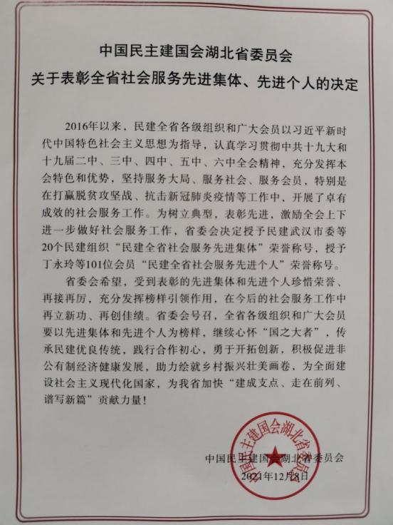 2021年12月12日,民主建国会湖北省社会服务先进个人和先进集体表彰大会在武汉洪山礼堂举行,我院刘俊松教授作为参政议政和乡村振兴代表,荣获“全省社会服务工作先进个人”光荣称号,这是继2016年后,他第二次获得上述荣誉。