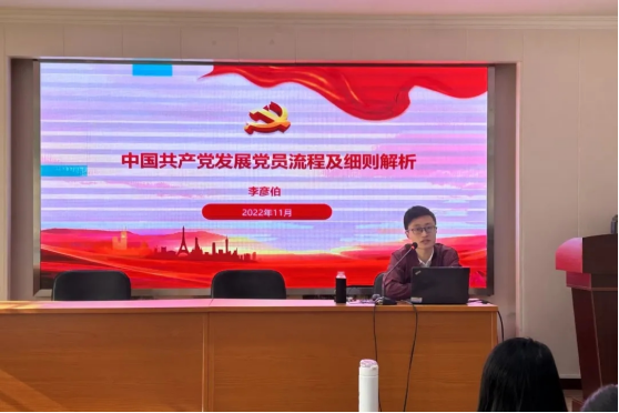 11月5日,学院党委副书记李岚带领全体党培班学员全文学习了二十大新党章,鼓励同学们争做新时代合格共产党员。接着,彭宇院长做了加强党史学习,促进学院、学科高质量发展的辅导报告。院团委书记邓琪老师开展了重温入党誓词的专题党课,她指出入党誓词是几代共产党人心血的结晶和奋斗的足迹,要求学员们要做到践行入党誓词不容丝毫偏离,信守誓言必须一诺千金、终身无悔。