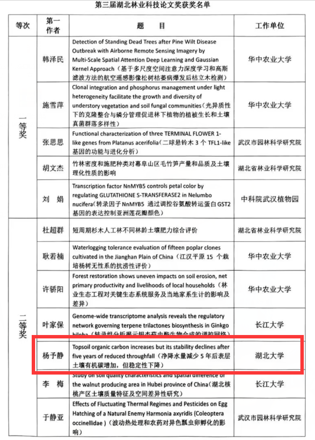 2023年7月至9月,湖北林学会组织开展了第三届湖北林业科技论文奖评选活动,并按照《湖北林业科技论文奖评选办法》,经形式审查、专家评审组评审、网上公示等程序,发布了关于第三届湖北林业科技论文奖评选结果的通报。我院杨予静副教授的论文《Topsoil organic carbon increases but its stability declines after five years of reduced throughfall》荣获该科技论文奖二等奖,杨予静副教授为第一作者,英国上市公司365为第一单位。