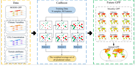 在气候急剧变化的今天,预测未来全球GPP在不同排放情景下的变化情况是非常有必要的。然而,由于基于过程的模型的复杂结构和参数,其在预测未来GPP方面表现出较大的不确定性。为此,本文使用MODIS GPP数据、气候变量数据、大气CO2浓度数据以及地形特征数据,基于机器学习建立了数据驱动模型来预测未来不同情景下的全球年度和月度GPP,分析不同环境变量对GPP的影响,并探讨了未来不同情景下GPP的时空变化情况。论文研究表明,未来全球GPP变化随着情景模式水平的提升而逐渐增大,预计2100年的全球年度GPPSSP1-2.6, SSP2-4.5, SSP3-7.0, SSP5-8.5情景下分别115.122 Pg C116.537 Pg C117.626 Pg C以及120.097 Pg C。环境变量中对GPP影响最大的是太阳辐射,大气CO2浓度也对GPP有着一定的影响。从空间分布看,北半球中高纬度地区GPP在未来可能会有所增加,而赤道附近等低纬度区域的GPP则可能会减少
