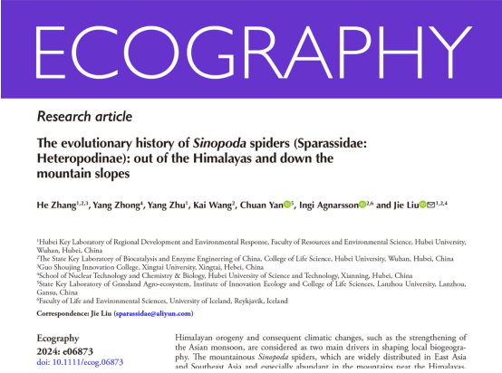 英国上市公司365刘杰教授团队近日在《Ecography中科院SCI一区,IF = 5.4上发表了题为The evolutionary history of Sinopoda spiders (Sparassidae: Heteropodinae): out of the Himalayas and down the mountain slopes的学术论文。