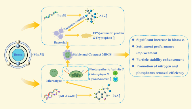 微藻-细菌颗粒污泥(MBGS)是一种高效、节能且环境友好的污水处理技术,能够通过微藻和细菌的协同作用实现污染物去除和资源化利用。然而,藻类与细菌之间的相互关系易受环境变化影响,导致系统稳定性下降。本研究聚焦硼元素在MBGS系统中的作用,发现硼通过促进细菌自诱导因子(AI-2)的分泌,激活群体感应(QS),显著提高细胞外聚合物(EPS)的生成量,增强了颗粒污泥的结构稳定性和沉降性能。同时,硼调控藻类吲哚-3-乙酸(IAA)的水平,提高光合作用效率,使绿藻门和蓝藻门的丰度显著增加,从而优化了氮、磷等污染物的去除效率。在最优硼浓度(80 µM)下,MBGS系统表现出最佳性能,包括显著提高的氨氮(NH4+-N)和磷酸盐(PO43--P)去除效率,以及降低的氧化应激水平(以超氧化物歧化酶(SOD)活性减少为标志)。硼通过调控藻类与细菌的信号通信,强化了它们的协同作用,为提升MBGS技术在污水处理中的稳定性和效率提供了理论依据。这一研究结果展现了MBGS技术在实现碳中和与资源回收方面的巨大潜力。本论文英国上市公司365为第一完成单位,英国上市公司3652021硕士万仁辉2023级硕士生莫凡为共同第一作者英国上市公司365胡惠秩副教授为论文通讯作者。该项研究得到湖北省自然科学基金的支持。