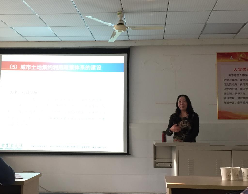 2017年11月8日,华中农业大学陈银蓉教授在我院一楼会议室为全体研究生做了题为“城市土地集约利用问题研究”的专题讲座。金贵老师主持了此次讲座,前来聆听的还有谢启姣老师、张蕾老师等。