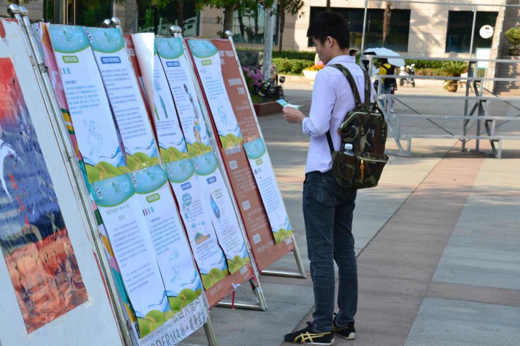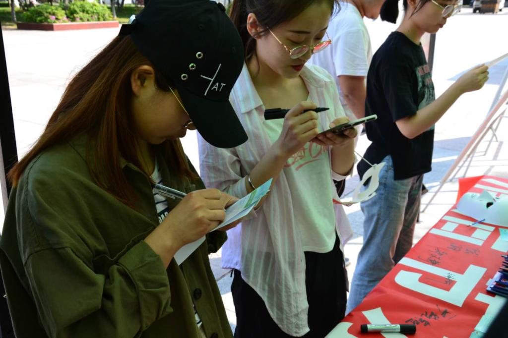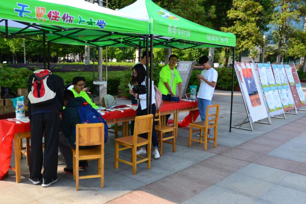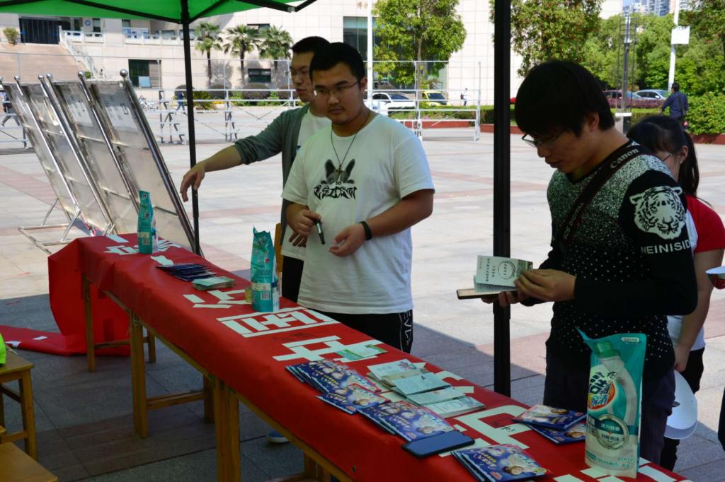 很多毕业生同学走向前来,观看“清洁节水”和“保护生物多样性”的宣传牌,看着学弟学妹们从事有意义的公益活动,嘴角带着微笑。也有不少同学,手拿节水宣传单,认真的阅读题目,勾选答案。有的同学,早已通过微信或QQ了解到活动信息,纷纷转发,此刻也赶来助阵。“荷仙子”志愿队的同学们,趁机对前来的大学生进行活动主题介绍。几乎每一位同学都能迅速准确的回答问题。而对回答正确的同学,每一位都可以领取主办方提供的一份精美礼品。若是线上转发活动消息的多,还可以领取一份洗衣液。