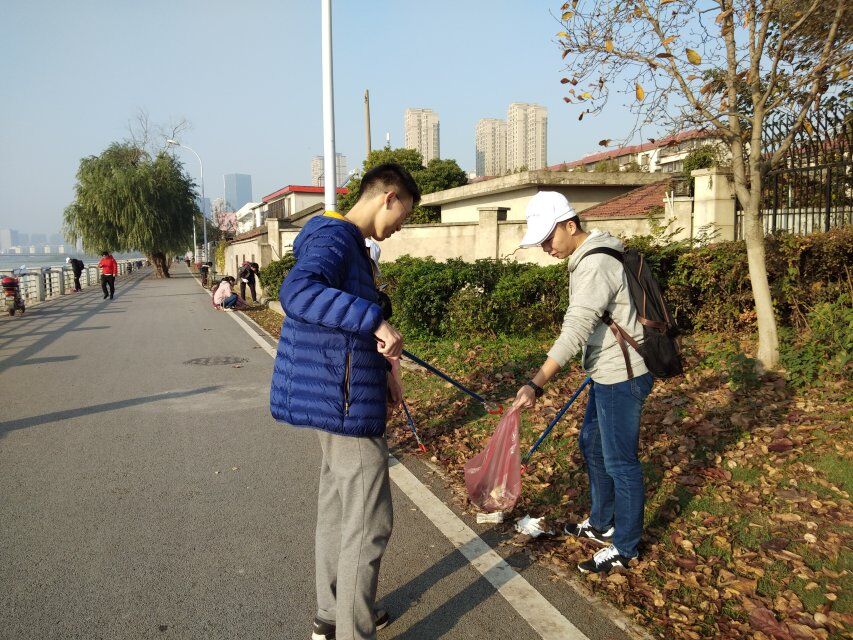 早上八点,志愿者们相约在资环院大门口集合,一同前往沙湖。由于清洁所用到的夹子过长,不便把路旁的垃圾放进自己的垃圾袋里,于是志愿者们两两合作,一人捡垃圾,一人撑袋子,他们还不时蹲下身、弯下腰,用手捡起那些微小却不易被分解的垃圾。归功于志愿者们对工作的热情,活动仅持续了两小时就告一段落,沙湖大部分垃圾都落入袋中。经过称重,本次活动共清理了14千克垃圾。