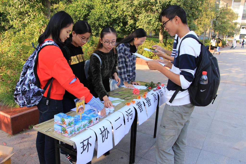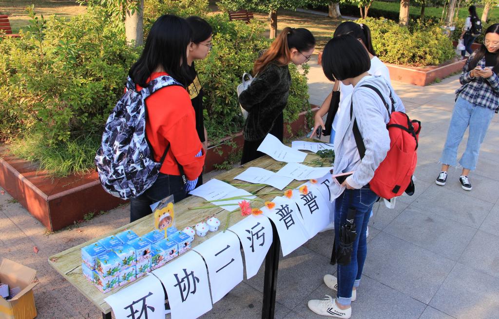 本次活动以有奖问答的形式普及有关环保知识,吸引众多同学参与,活动现场热闹非凡。在环保志愿者协会精心布置的竞赛点前,同学们纷纷领取试题,参与知识竞赛活动。热闹的气氛也引得众多行人驻足,询问参与活动的途径。参与者对环保事业的热情和志愿者们的积极工作,使得比赛奖品不一会就被发放一空。来自2018级地理科学专业的志愿者吴艳林说:“今天天气这么冷,却有这么多热情的同学们来参加我们的活动!而且大家答题的准确度也非常高!看来环保理念正在逐渐深入我们这些新时代大学生的内心!”