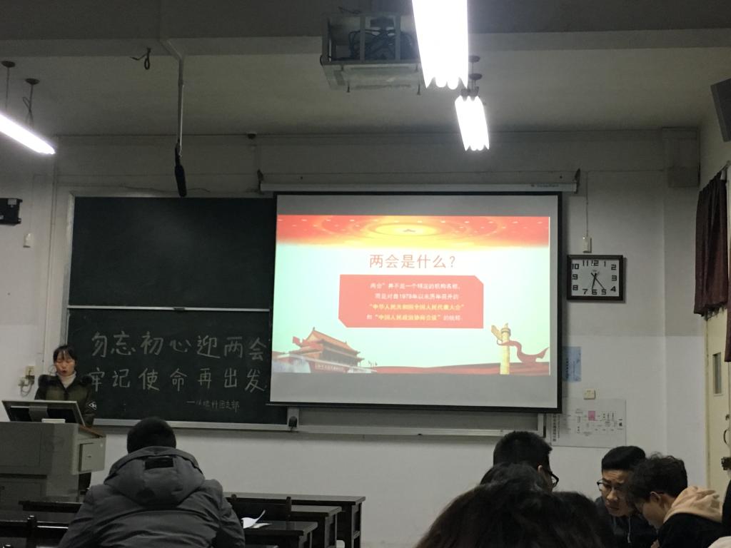 在回顾完过去的政府工作报告后,团支书继续为同学们讲述此次两会的工作重点。例如,在收入上提高个人所得税起征点。洪亮的声音和着党的目标,深深印在的同学们的心中。团支书还提到了政府工作报告中谈及的民生大事,这些切实深入到生活中的每一条政策无不令在场所有人震惊。