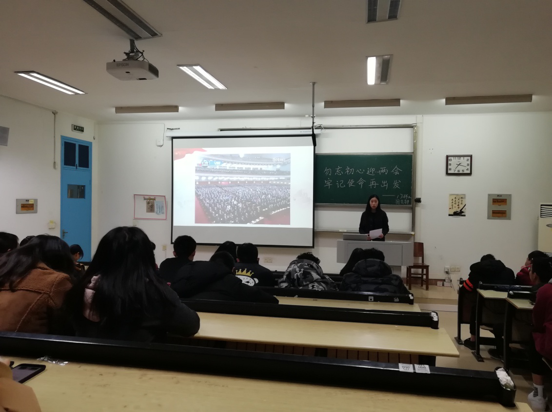 团支书张博先是详细的为我们介绍了两会,并带领大家一起观看了《习近平总书记宪法宣誓》。之后又观看了人民日报新媒体发起的“中国很赞”手指舞挑战中易烊千玺的MV加油视频,“加油,为更好的自己,为更好的中国!”