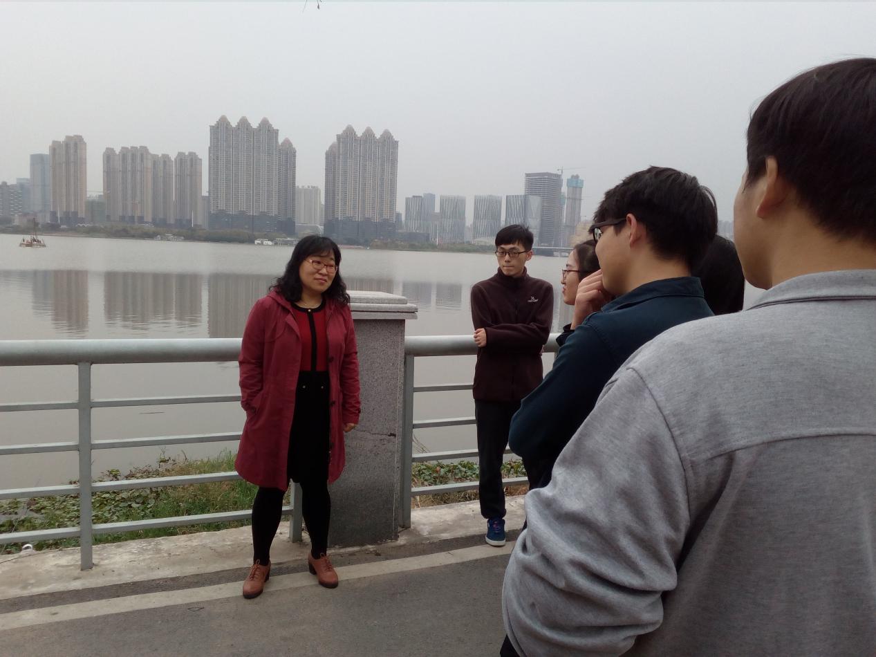 在沙湖的围栏外,15级环境工程专业的杨武湖先为志愿者们介绍了水面上大片的水葫芦,并简单讲解了水葫芦泛滥又将如何引发危害。借此抛砖引玉,赵丽娅老师便对沙湖的污染和整治进行了更加详尽的介绍,帮助在场的志愿者们更全面地了解沙湖污染情况。期间,赵丽娅老师更是引用她女儿对她说的一段话来告戒志协者们:观察一件事时最重要的是心境,心静了才能最大效率的完成。