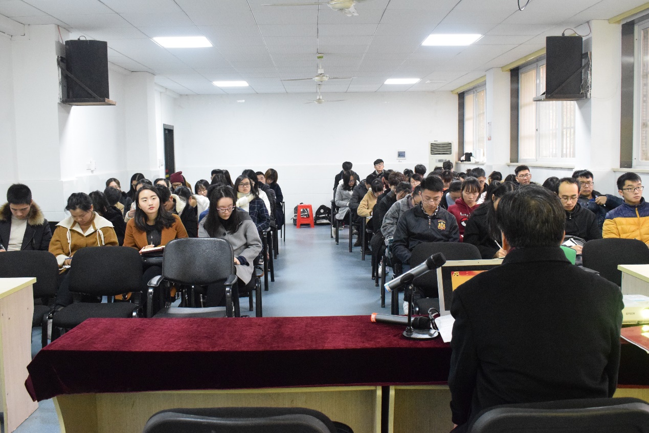 王体正教授分享了关于十九大的历史地位及重大贡献、十九大作出了重大政治判断、十九大形成了新的理论创新成果——习近平新时代中国特色社会主义思想、十九大确立了新时代中国特色社会主义新目标、十九大确立了坚持和发展中国特色社会主义的基本方略等十个方面。王体正教授用“四最”——内容最丰富,篇幅最大,开放程度最高,影响最大,向大家介绍了十九大的特殊历史地位。当谈到中国特色社会主义的基本方略中的可持续发展战略时,王体正教授强调:“虽然我们国家资源丰富,但在改革开放的三十年中,资源环境受到了很大的破坏,如今国家非常重视资源环境的保护,这正是需要你们的时候。”呼吁在场发展对象学好专业知识,为建设美丽中国出一份力。王体正教授引用梁启超先生的“惟希望也,故进取。 惟进取也,故日新。” 鼓励在场的发展对象,树立正确的三观,要有对国家道路、理论、制度、文化的自信,积极进取,“有一张蓝图干到底的决心”。在场五六十名发展对象深受王体正教授的感染,对十九大内容和精神有了更深的认识,对未来的“蓝图”也有了信心,本次培训在阵阵热烈的掌声中结束。