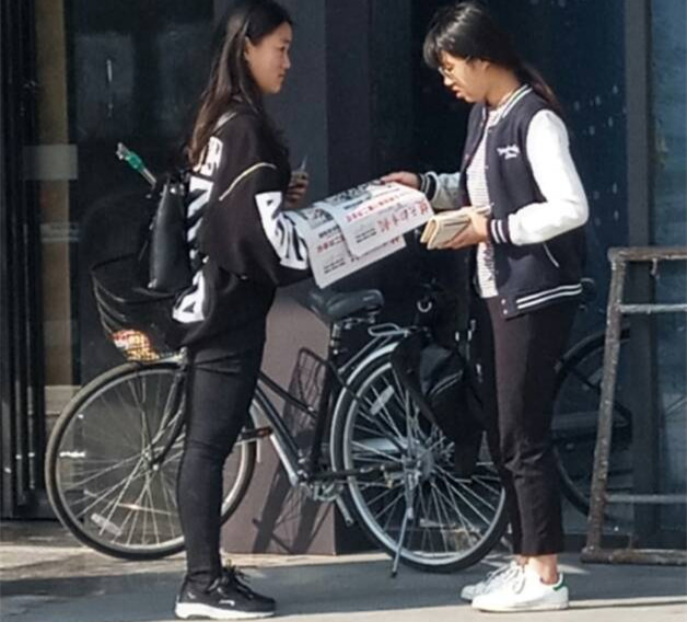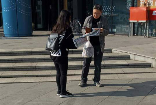 在校门口集合领取报纸后,各个小组自行出发前往各自的地点。由于学校附近大范围修路,道路并不平坦,给这次的卖报之行增加了一定的困难,但成员们互相帮助,都顺利并快速地来到各自的据点。在卖报纸的过程中,成员们分头行动,主动上前与路人交谈,向大家介绍这次活动。志愿者们早早出发,尚未来得及吃早餐,仅仅在路上补充了一些面包和饼干,但他们对活动的热情不减,阳光下的笑脸,递出的一份又一份的报纸,形成一道独特的风景线。